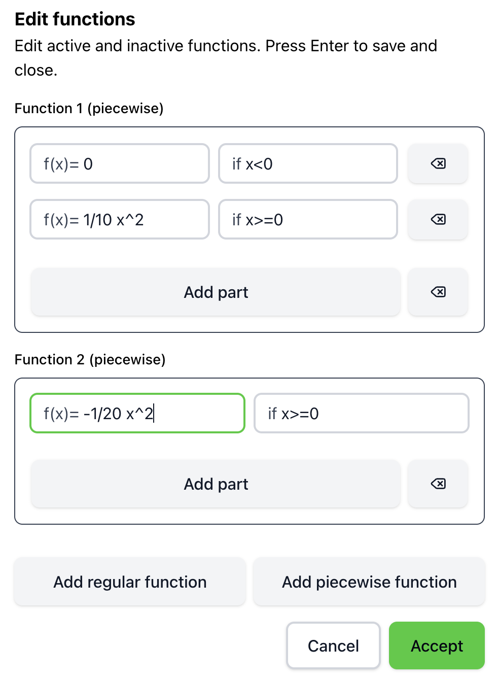 You can manually edit the JSON file to modify function definitions or graph settings before importing it back into Audiofunctions+. For instance, you can visualize the following “non-graph” function